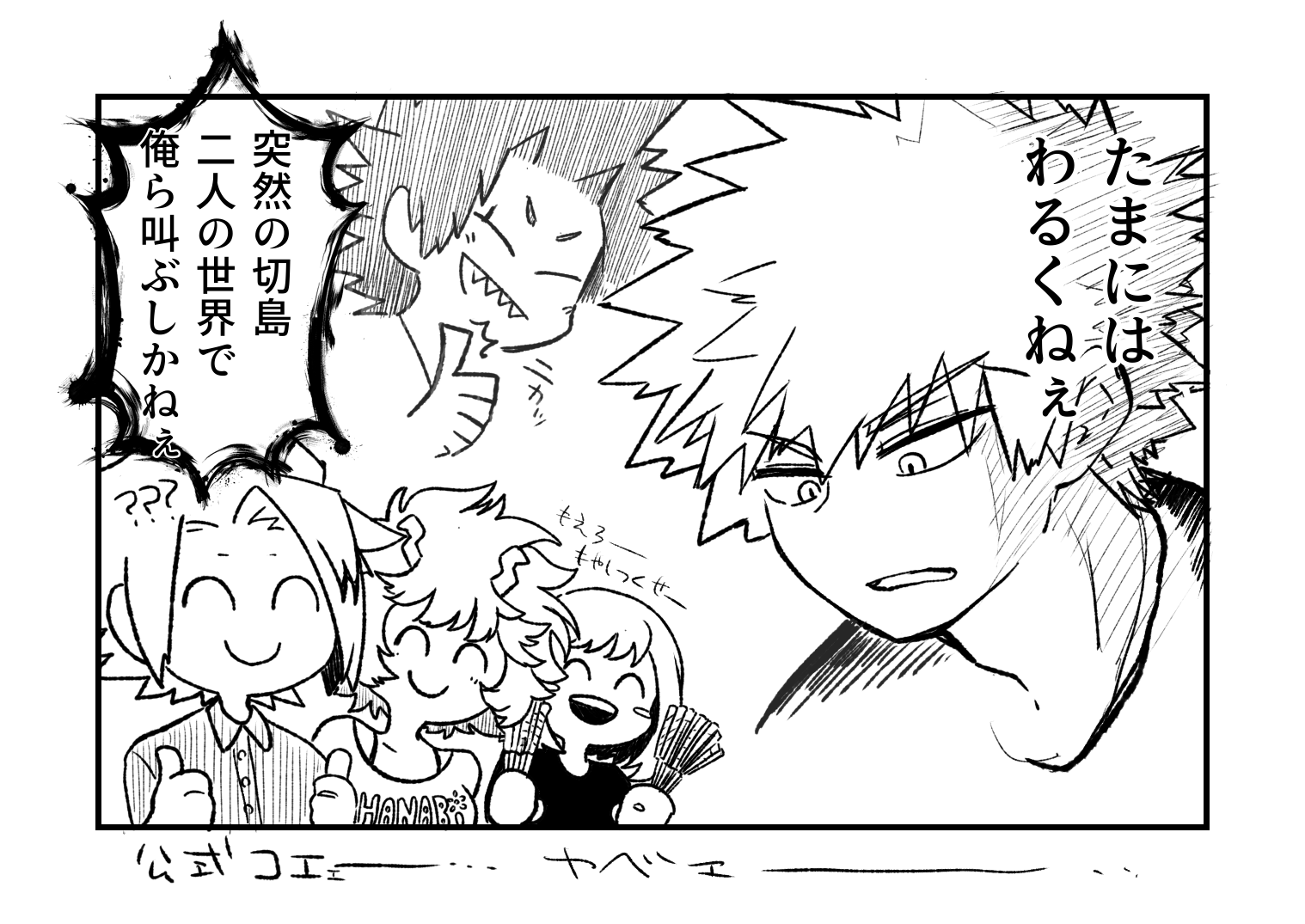 番外編の花火、切島は爆豪を見てるし、爆豪も自分のじゃなくて切島の花火見てる感じだし3コマ目と4コマ目の間に一体何があったんだってばよ